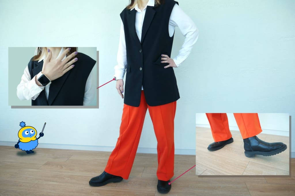 いつも起きて20分で家を出るというKさんですが、実際はベストスタイルや、アクセントとなる差し色パンツも着こなします。