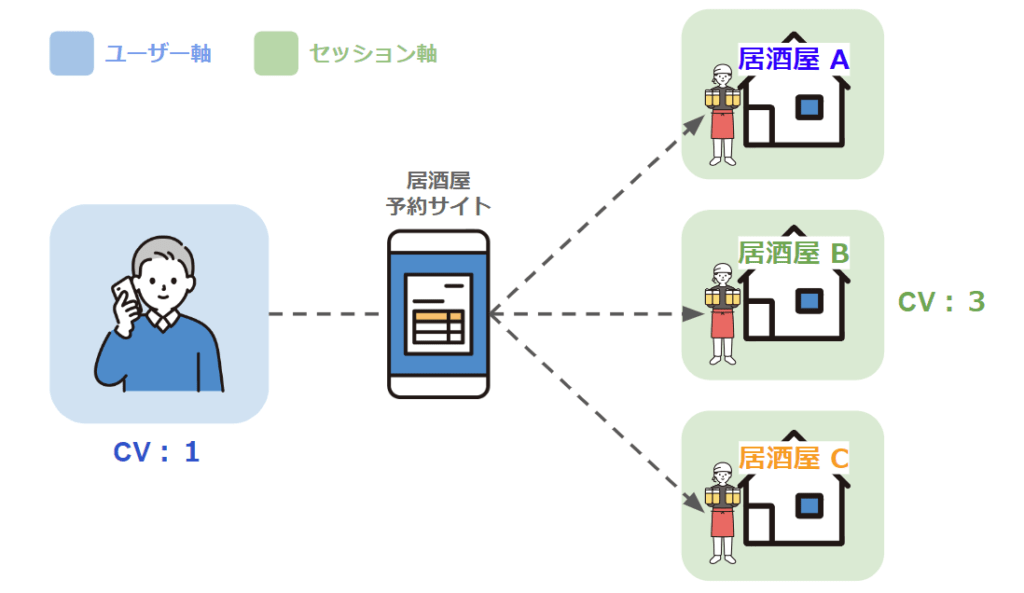 その場合、セッション軸でのカウントはセッション内で何店舗に電話予約(犯行)したかとなるため、実際のコンバージョンへつながった件数に近しい数値になります。