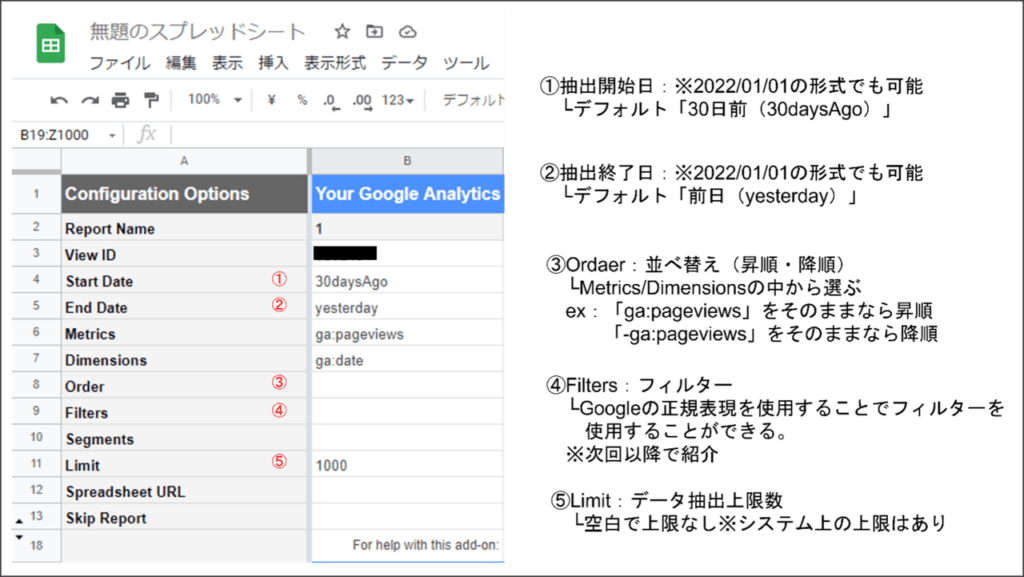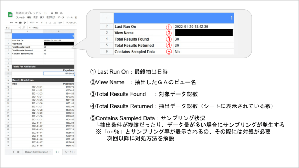 ④は抽出したデータのうちシートに結果として表示しているデータの個数。例えば総数10,000となっているが、詳細設定の際に「Limit」を「1,000」とすれば、ここの数値は「1,000以下」となります。