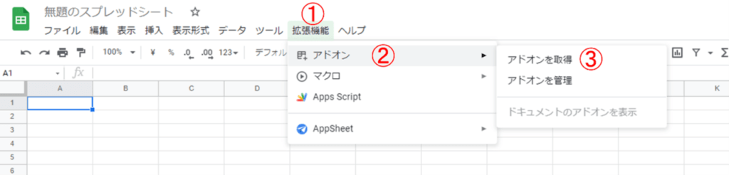 ① スプレッドシート上部「拡張機能」のメニューを選択