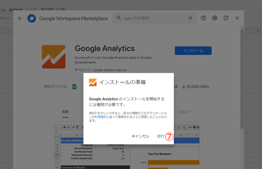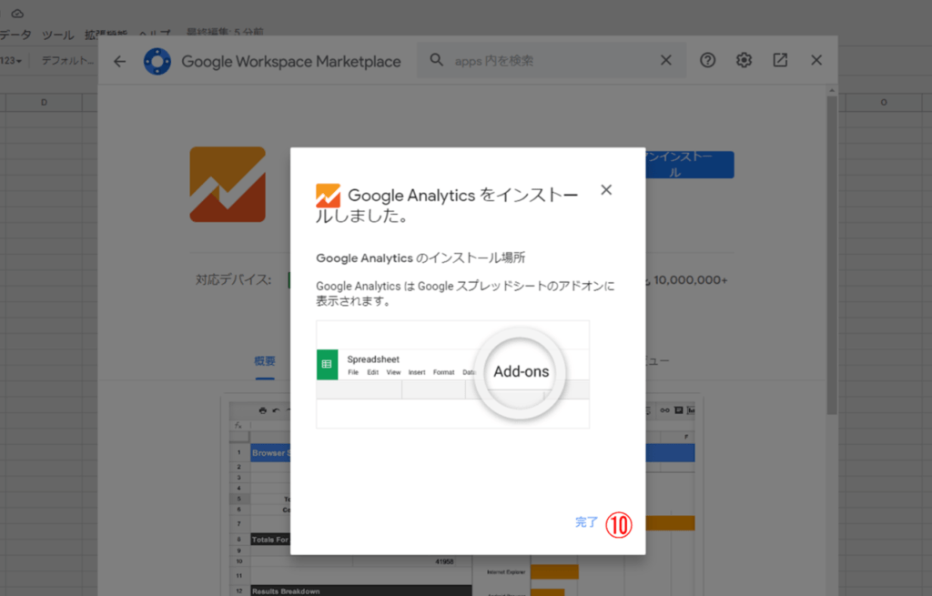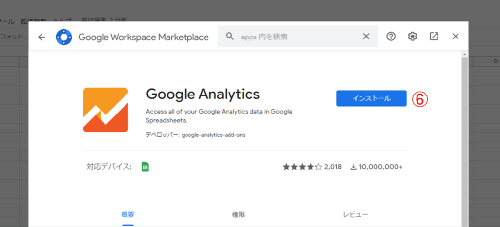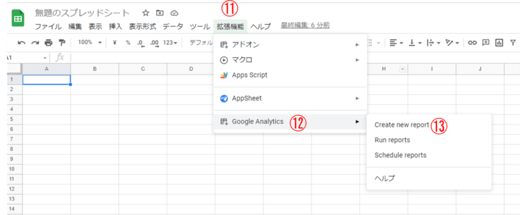 GoogleAnalyticsアドオンの導入自体は至って簡単。Googleスプレッドシート(以下:スプレッドシート)にアクセスして下記手順に沿ってインストールして貰うだけです。