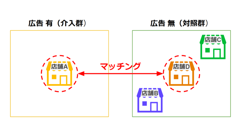 街の店舗を例とすると、「店舗A(広告有)」と似た特徴(同条件に近い)を持つ店舗を「店舗グループ(広告無)」の中から見つけることで、「広告を行わなかった場合の店舗A」としてマッチング & 比較しよう、という試みです。