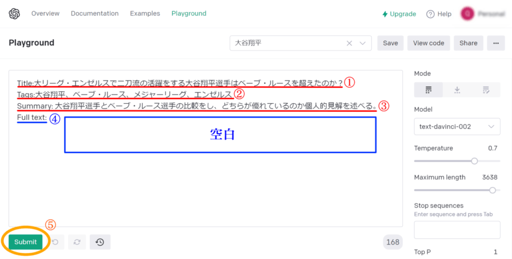 ⑤「Submit」 :ボタンを押下し、文章(記事本文)を生成