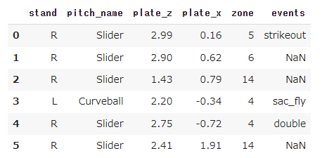 今回使用したデータの中身が下記となります。主に「stand」 「pitch_name」 「events」のデータカラムを使用しました。