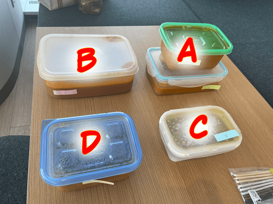 A~Dに割り振り、実食の準備。自分で作ったカレー以外は誰が作ったものか、わからない状態です。